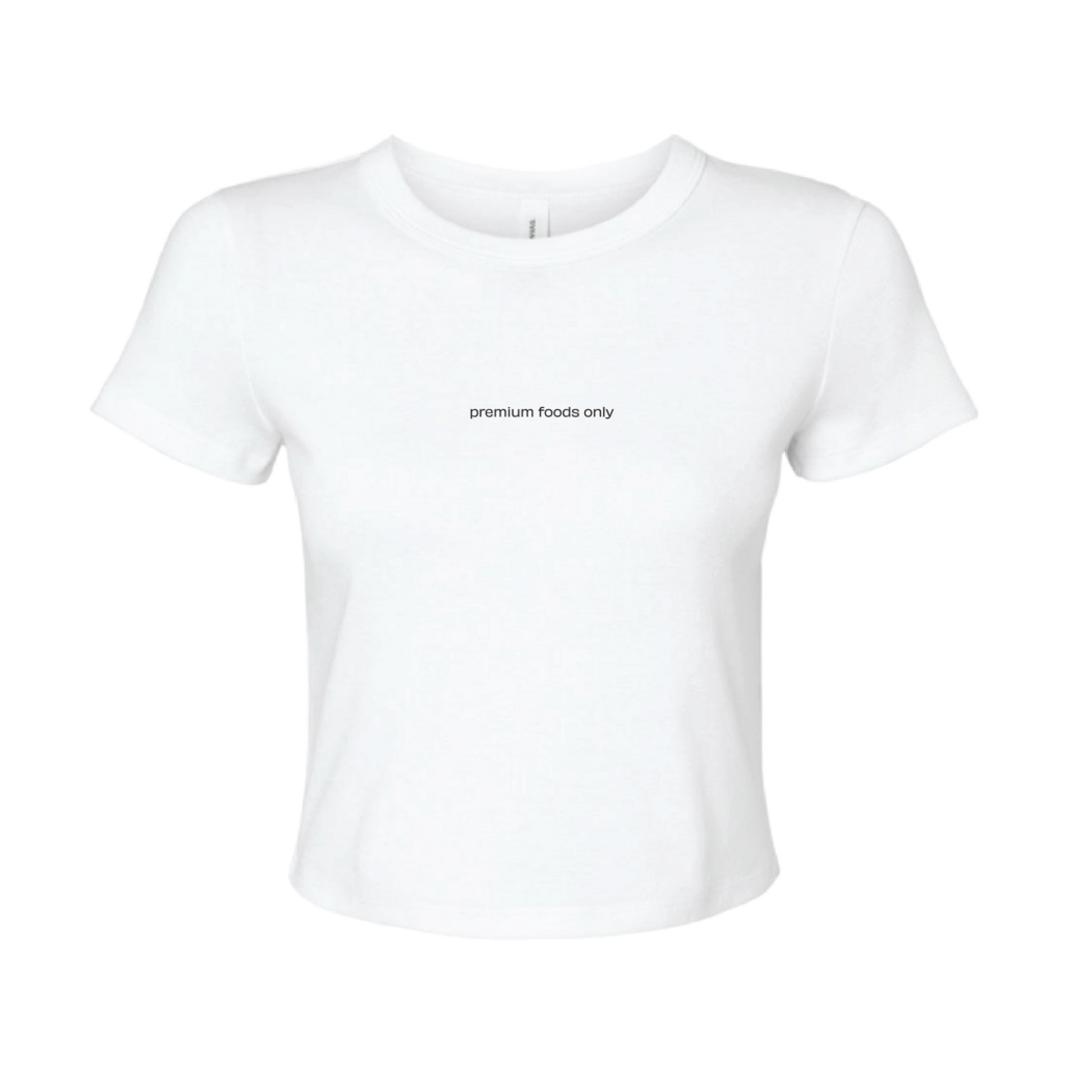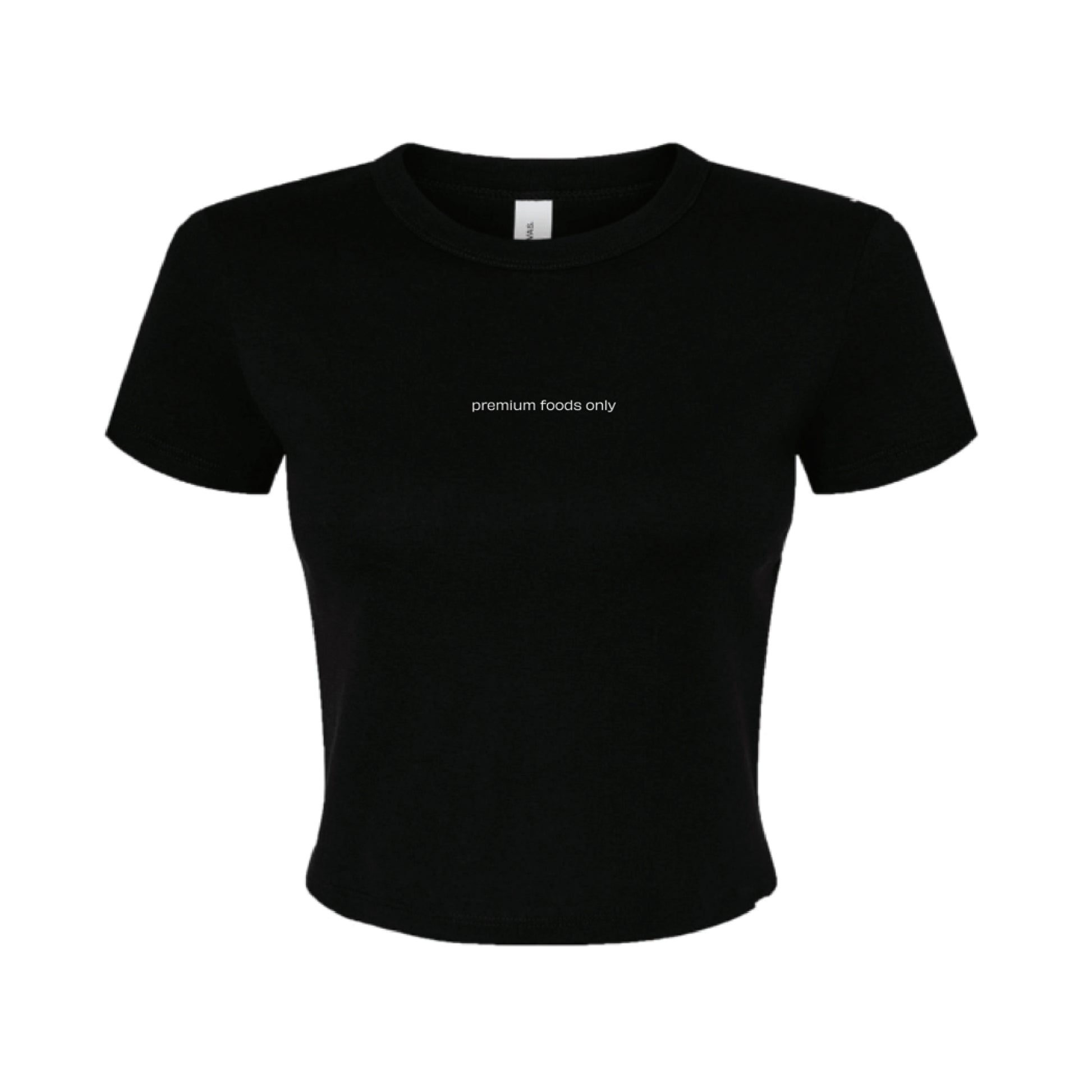 cropped top baby t-shirt with print: 'premium foods only.' available in black or white. wearing a size small here. for a less cropped look, size up!