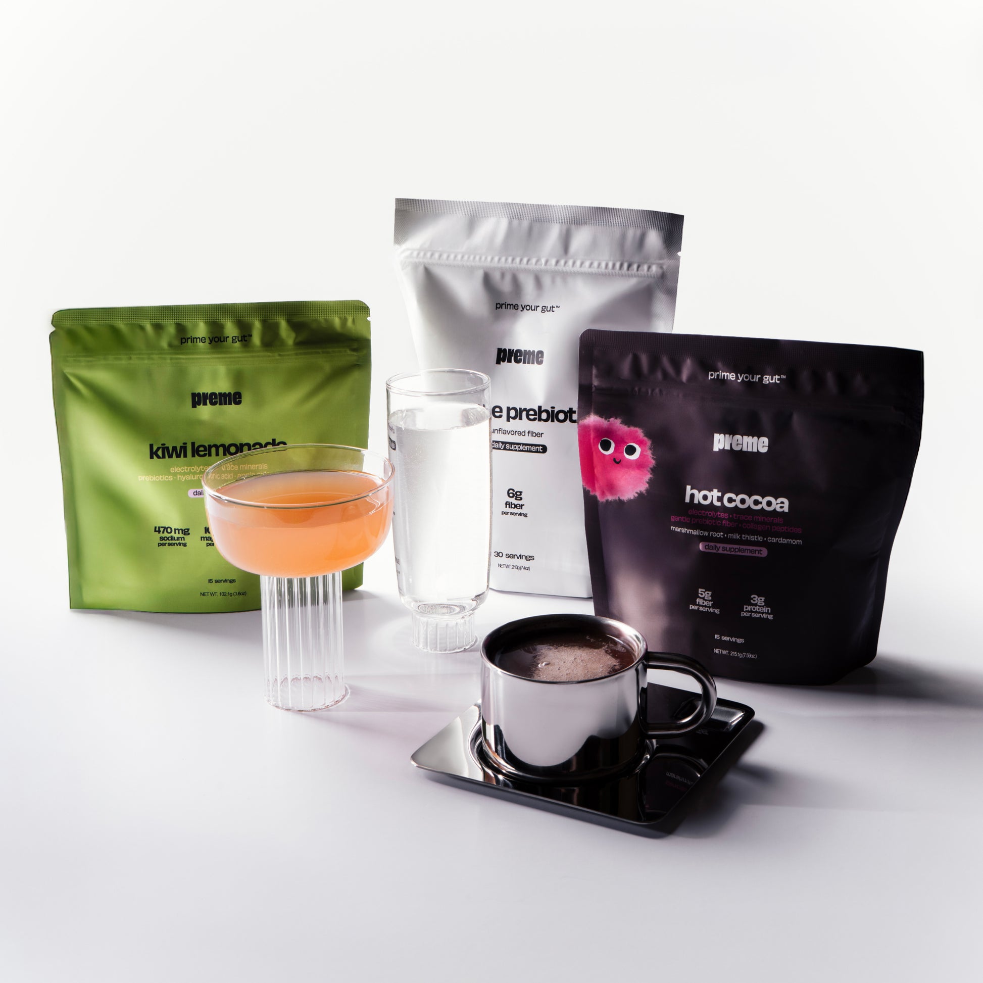 Our starter bundle includes 3 FODMAP friendly gut building powders: our gentle prebiotic fiber, kiwi lemonade electrolytes, and hot cocoa electrolytes.